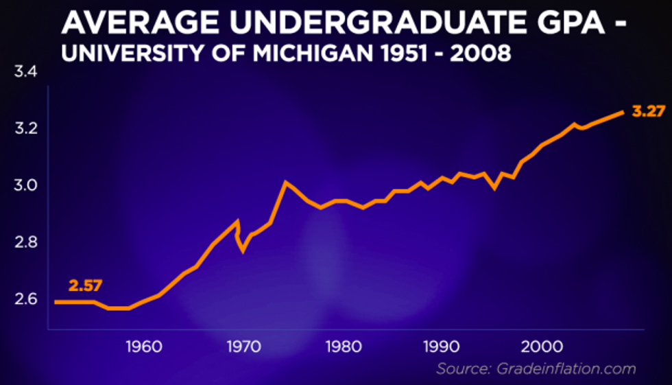 Or let’s take the case of the University of Michigan, the average GPA was 2.57 in 1950. Let’s watch it go up up up up to 3.27 today.