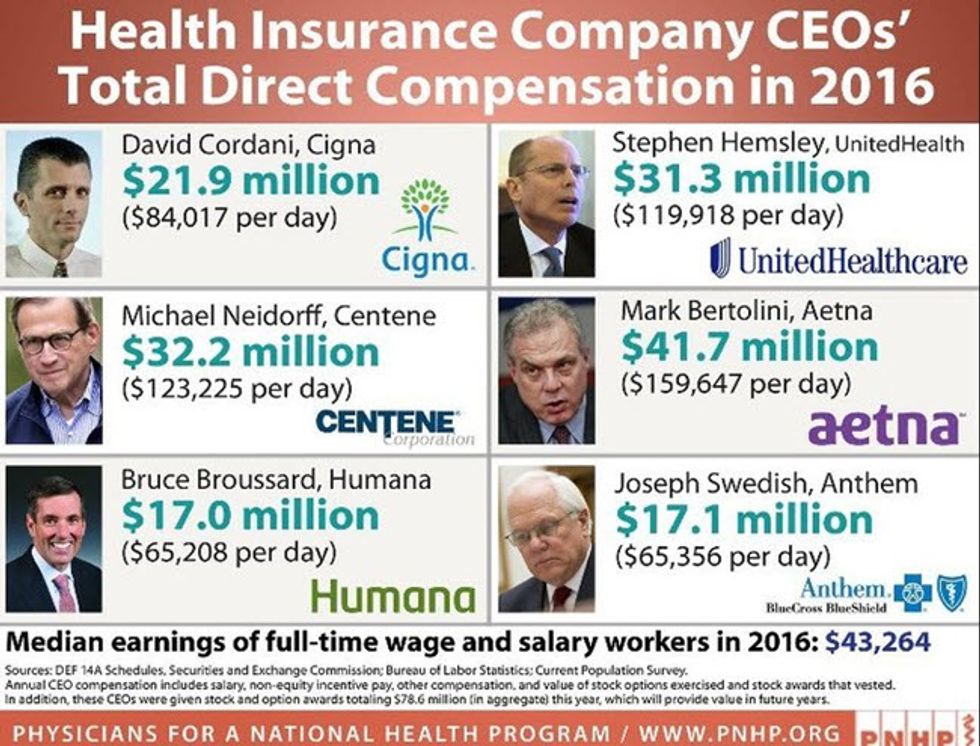 The average family health care insurance premium in 2016 was $18,764, meaning that Mark Bertolini from Aetna alone required 100% of the premiums from more than 2,200 families just to pay him in 2016. Of course, the “C-suite" of these health care insurers are loaded with other high-paid parasites who are just as busy gouging the young and old alike.