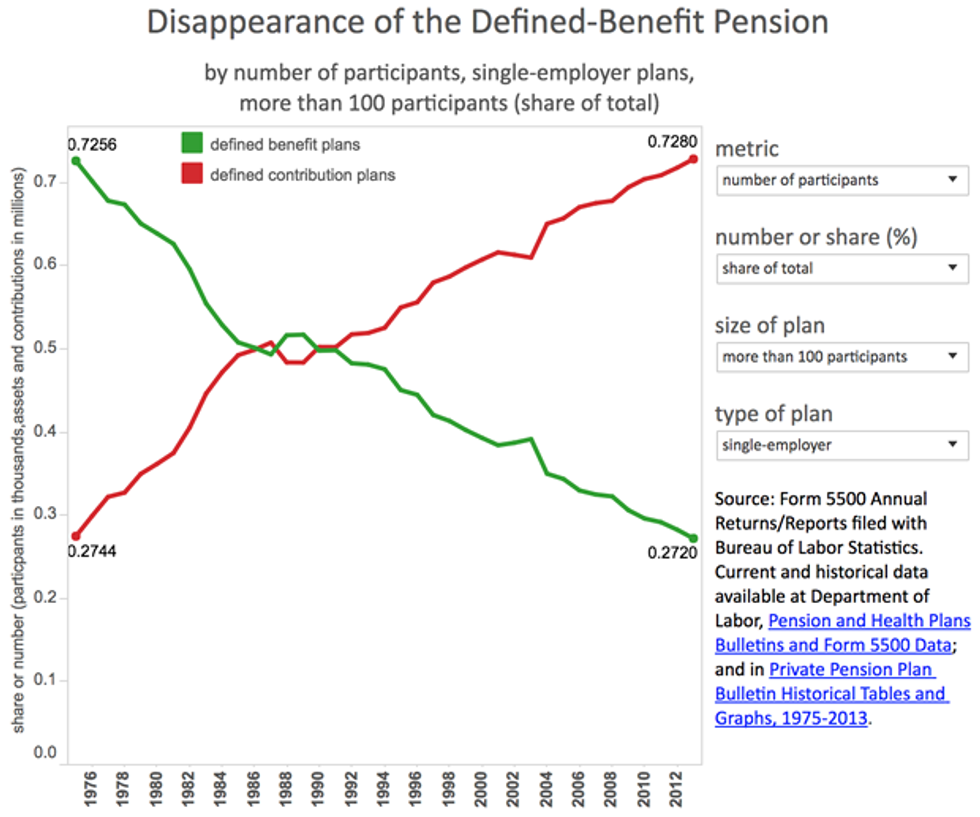 The table below shows how vigorously pensions (green) have disappeared since the introduction of IRAs and 401ks (red):