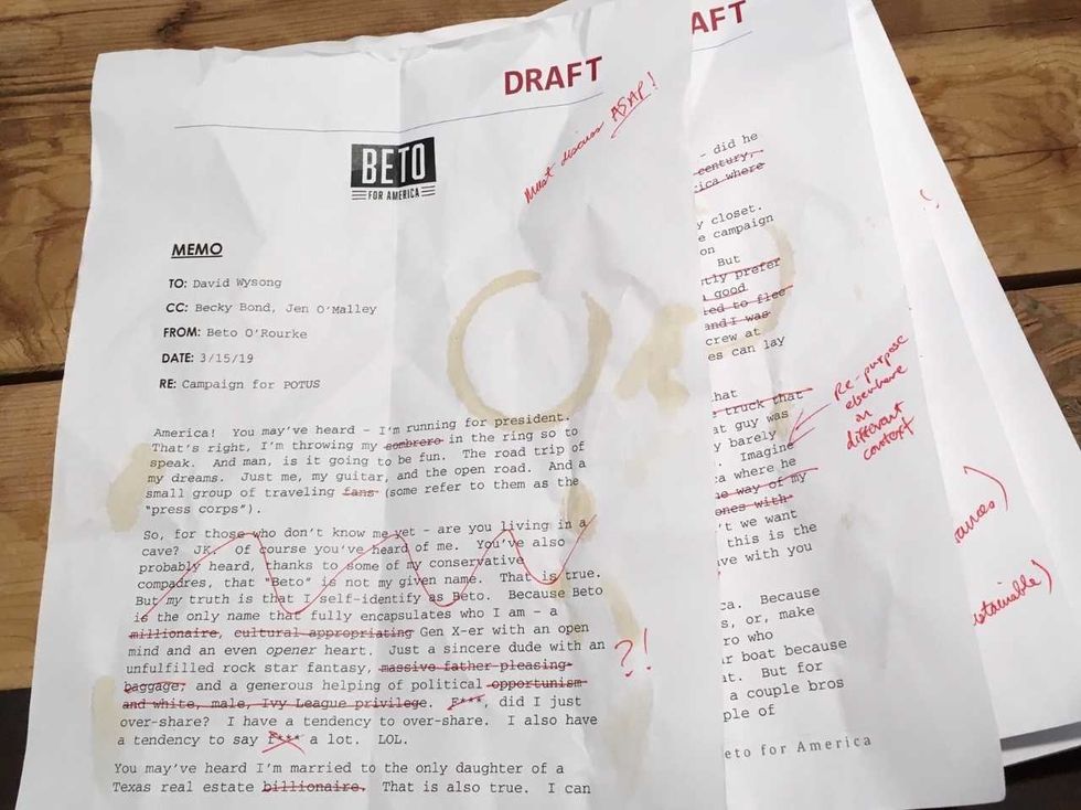 An astute fan of the Glenn Beck Program recently found a curious document that was apparently left on a corner table of an El Paso coffee shop. Upon closer examination of the coffee-stained pages, the fan was rather surprised to discover it was a Beto campaign memo containing the rough draft of a communication from Beto to the nation explaining his campaign for president. The pages contained plenty of red ink – obviously whichever campaign adviser reviewed the communication wanted a lot of changes. They didn't mince words either, writing " Must discuss ASAP!" in red at the top of the first page. On page three, when Beto apparently planned to address the time he broke into the University of Texas at El Paso campus, the adviser bluntly wrote, "What? No." in the margin. Below is the full text of Beto's draft: