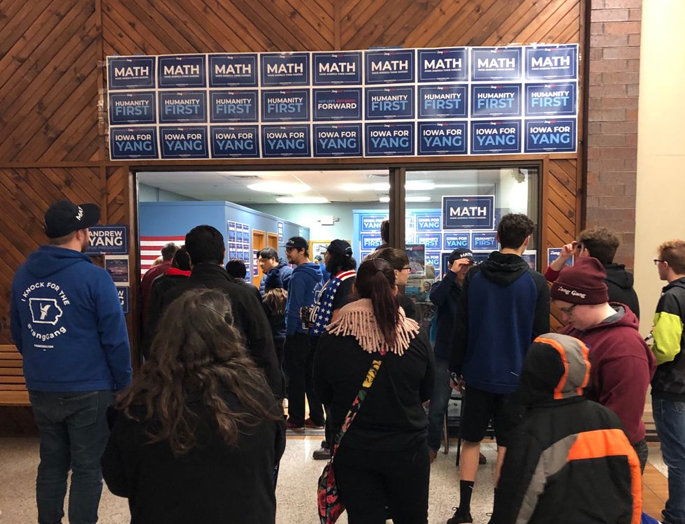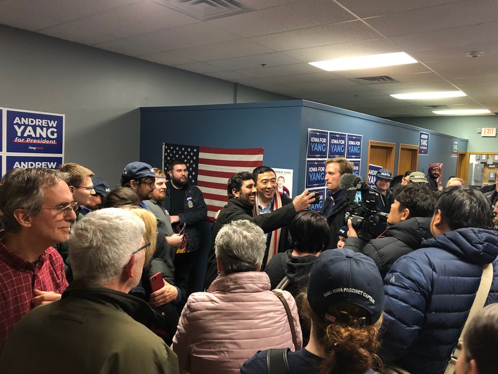 In Oscaloosa, Yang's supporters all huddled into the crowded shopface of the room, scoping around to catch a glimpse of Yang out the back door. They'd bottle-necked into the room and they appeared to be stuck, clogged.