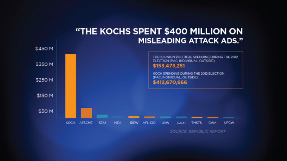 To be fair, our unbiased source Republic Report notes that the Koch spending is Pac, individual, and outside spending. In this context, outside spending apparently means the spending of every single person in America who agrees with the Koch brothers.