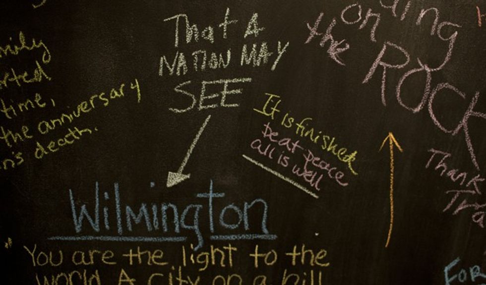 GLENN: There was a musician there playing music while people were praying. It was so unbelievably cool, and I was talking to the lady who started it, and I actually sat at one of the chalkboards, and I said a prayer. And I wrote on the chalkboard my prayer that the nation would see Wilmington. And I don’t mean that they would see the trouble, they would see the strife. This is a town that’s 12,000 people. They lost 7500 jobs. Not that they would see that. They’ve seen it. You watch 60 Minutes and see that, that’s all they show you. What they need to see is the people. They need to see the joy. They need to see the teamwork. They need to see the people coming together. And as I wrote that on the chalkboard and I walked back into the back and I gave the woman who started this great place a hug and she said, "You know, I started this a few years back." And she said, "I just, you know, I just stood where I was told to stand." And she said, "It came to me I should start a prayer center here in town." She said, when I had that thought, I had the impression that it would be the start of something for the nation. That it would — that the eyes of the nation would see this and it would inspire them and we would get through our tough times."