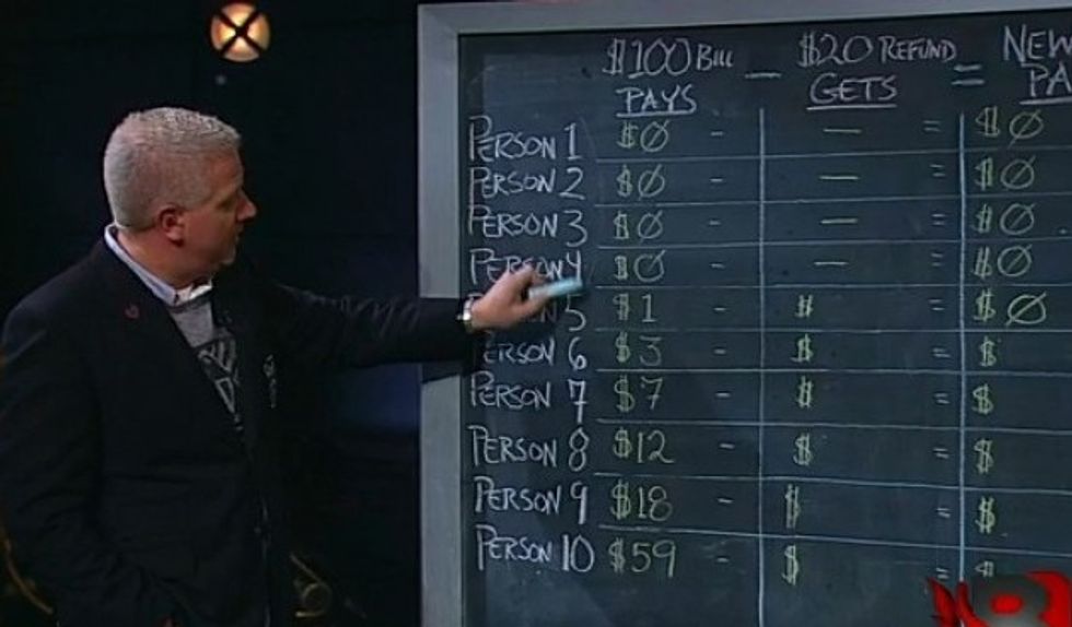 To illustrate his point, he applied how America’s overall tax burden currently stands to a hypothetical group of 10 friends. These friends meet after work regularly for a few drinks, and they decided to split the bill using the same method our tax code forces people to pay – was it ‘fair’?