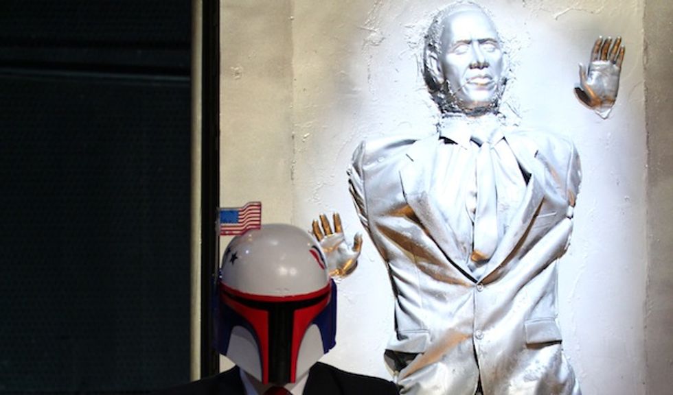 Glenn explained in the eighth episode of Star Wars, the clean cut, suit wearing Romney Fett chased Obama and trapped him in a block of carbonite.