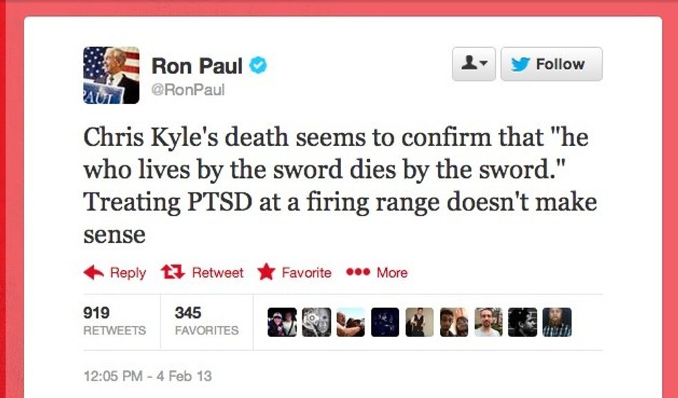 He's not a doctor. He didn't pretend to be a doctor. He was helping a friend. That's it. But yesterday in something I couldn't believe happened. Yesterday former congressman Ron Paul took to that brave platform we all call Twitter and tweeted this: Chris Kyle's death seems to confirm that "he who lives by the sword dies by the sword". Treating PTSD at a firing range doesn't make sense.