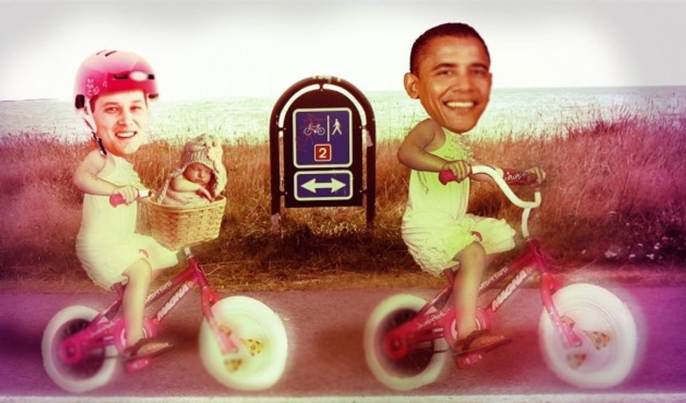 GlennBeck.com has obtained exclusive photos of Stu's maternity leave where he appears to be riding a little girl bike alongside the President. While Obama was supposedly vacationing in Florida with golf superstar/sex addict Tiger Woods, the above photo shows that more was going on than previously revealed. Could this be why the White House press corp was denied access to the President all weekend?
