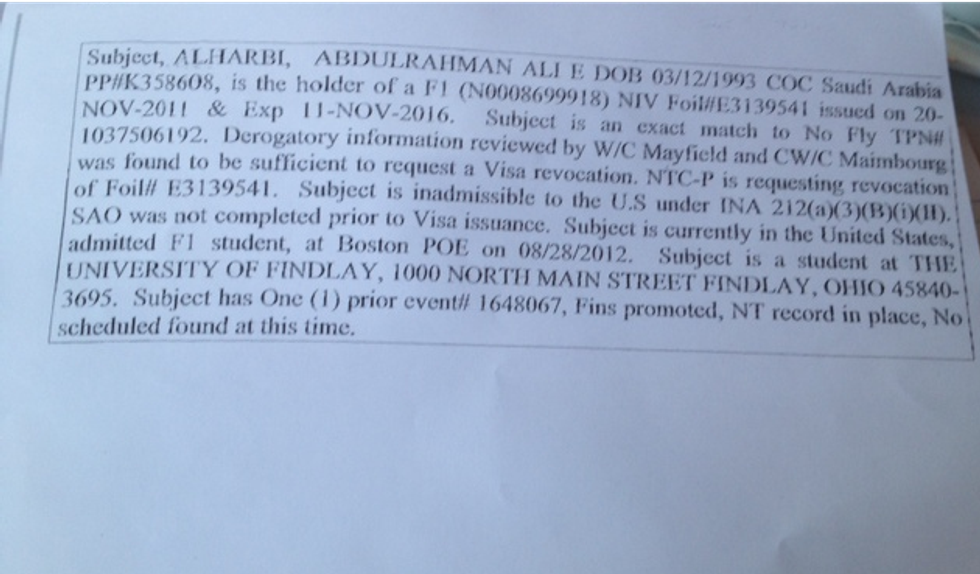 1) The event file created on Abdul Rahman Ali Al-Harbi indicated on page two that he is armed and dangerous.