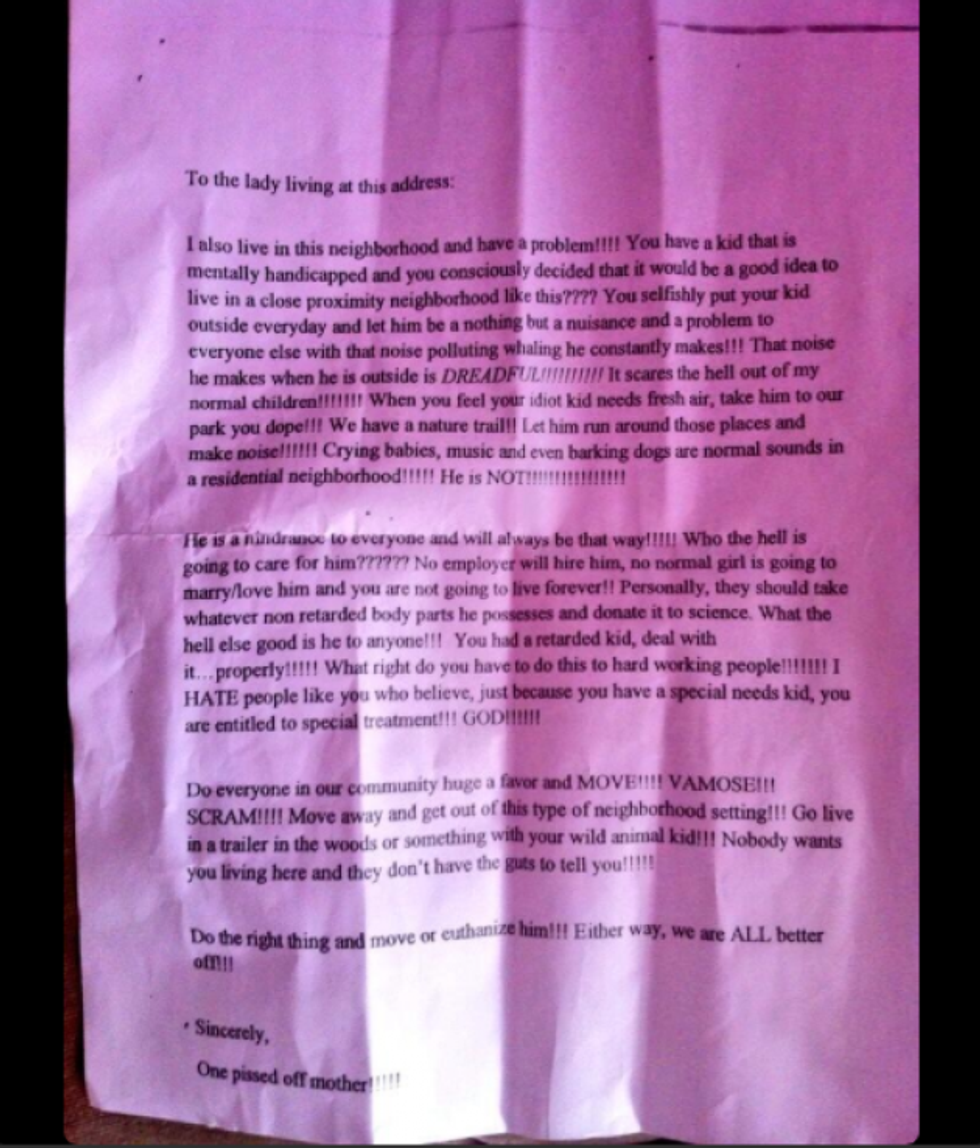 The letter, which could be described as malicious at best, begs Karla Begley, the mother of the severely autistic 13-year-old, to move out of the neighborhood.