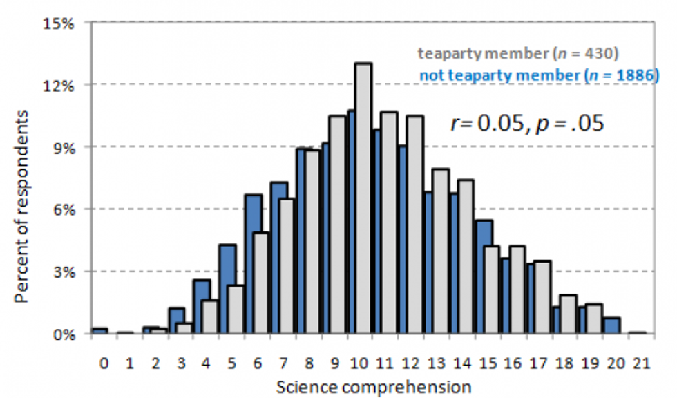 Except that it has the opposite sign: that is, identifying with the Tea Party correlates positively (r = 0.05, p = 0.05) with scores on the science comprehension measure: