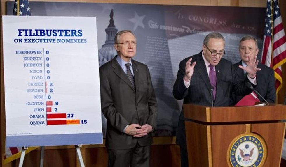 President Obama, Sen. Harry Reid (D-NV), and others are heralding the passage of the nuclear option as an opportunity to get things done in Washington, but if you flash back to 2005 when the Republican-controlled Senate threatened to jam through the very same thing, they were singing a very different tune. Listen to the hypocrisy below: