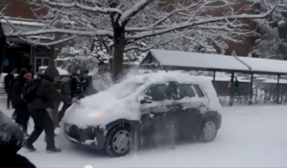 The incident was recorded and the clip below shows a seemingly innocent bystander who is driving his car through the OU campus when he is bombarded with snowballs being thrown at his vehicle.