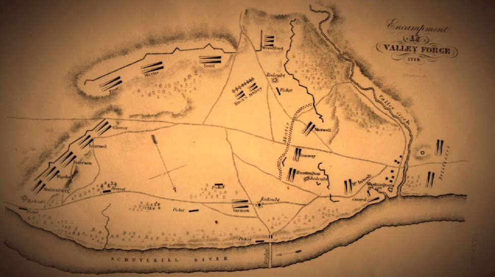Valley Forge, Pennsylvania is known as the famous site for George Washington’s winter camp. Set up in December of 1777, the location was a prime position for protection, with a river on one whole side, and two shallower creeks; forcing attackers to have to go uphill.