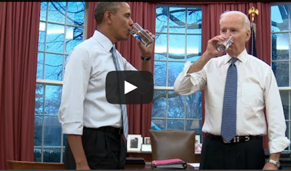 In the video, the President and Vice President go for a jog around the White House – outfitted in their workday best dress shoes and ties – before meeting back in the Oval Office for a refreshing glass of water.