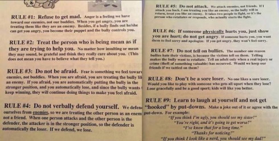 Parents of elementary school students in Nebraska are up in arms after fifth grade students at Zeman Elementary School were sent home with a “flyer” outlining some bizarre best practices for dealing with bullies. Concerned parents have called the worksheet, which outlines nine “rules” on how to handle bullies, “ludicrous,” and the school district has since apologized for disseminating the “inaccurate information.” On radio this morning, Glenn ran through the nine rules and couldn’t help but question “how this could possibly happen” in Nebraska.