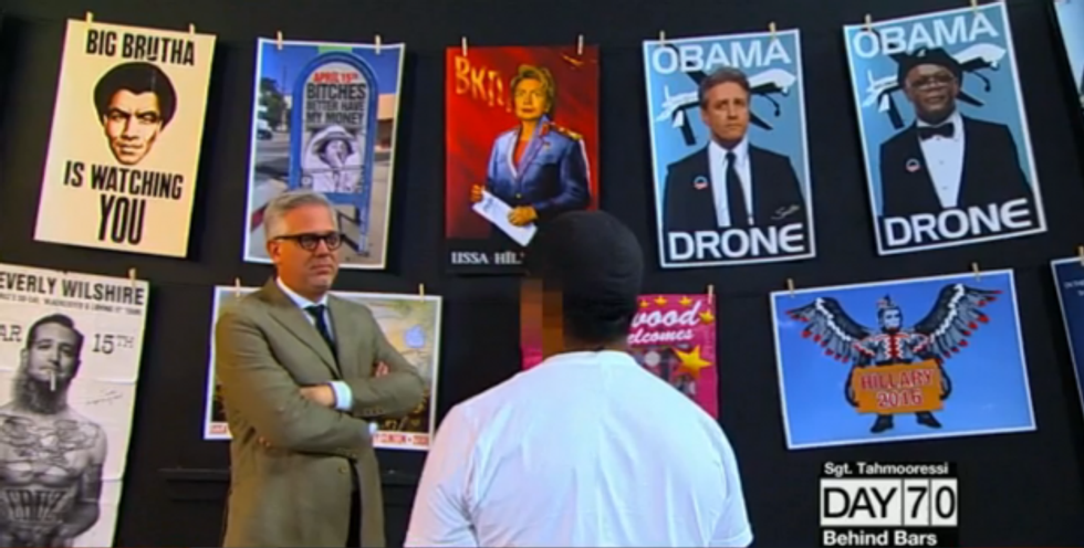 To begin, Glenn asked SABO to run through some of his most iconic works. From a poster of a tattooed, smoking Ted Cruz to the 'Abortion Barbie' poster featuring Texas gubernatorial candidate Wendy Davis.