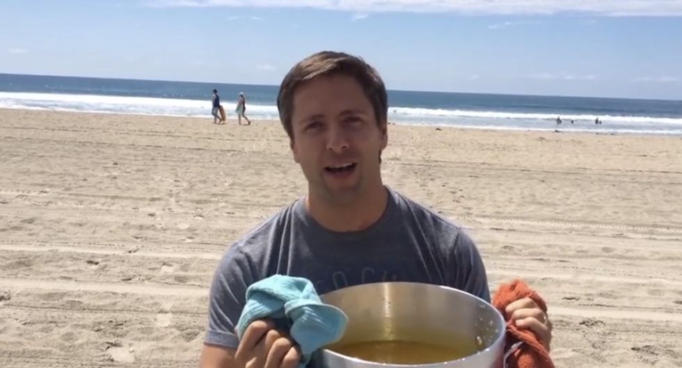 UPDATE: As it turns out, Mike Slater was pulling a bit of a fast one on all of us - though his heart is in the right place. In a new video, Slater admits it was not boiling hot soup in the bucket he poured over his head on a sunny California beach earlier this week. Based on this new video, however, it seems like his challenge to the ISIS member who beheaded American journalist James Foley still stands.