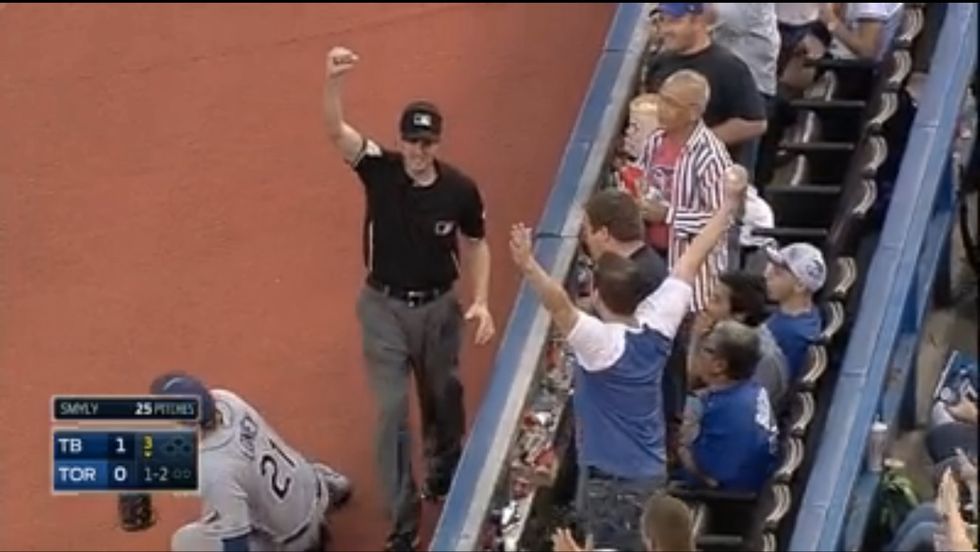 As you will notice, Stu reached over the stands to catch a foul ball hit by Blue Jays center fielder Colby Rasmus. At the same time, Rays first baseman James Loney slid toward the wall in an attempt to make the catch. Because MLB Rule 3.16 states “should a spectator reach out on the playing field side of such fence, railing or rope, and plainly prevent the fielder from catching the ball, then the batsman should be called out for the spectator's interference,” Stu's catch actually cost his team an out.