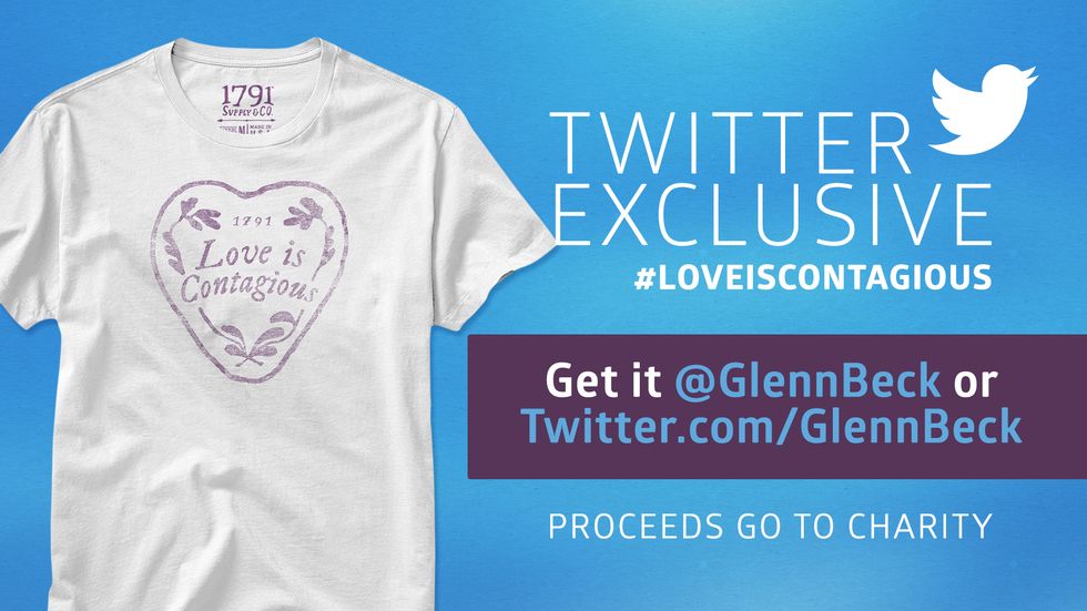 Today available exclusively through Twitter by following Glenn at @glennbeck or Twitter.com/glennbeck the 'Love is Contagious' t-shirt. Please retweet the tweet we have posted to help us spread love and raise some money for a good cause.
