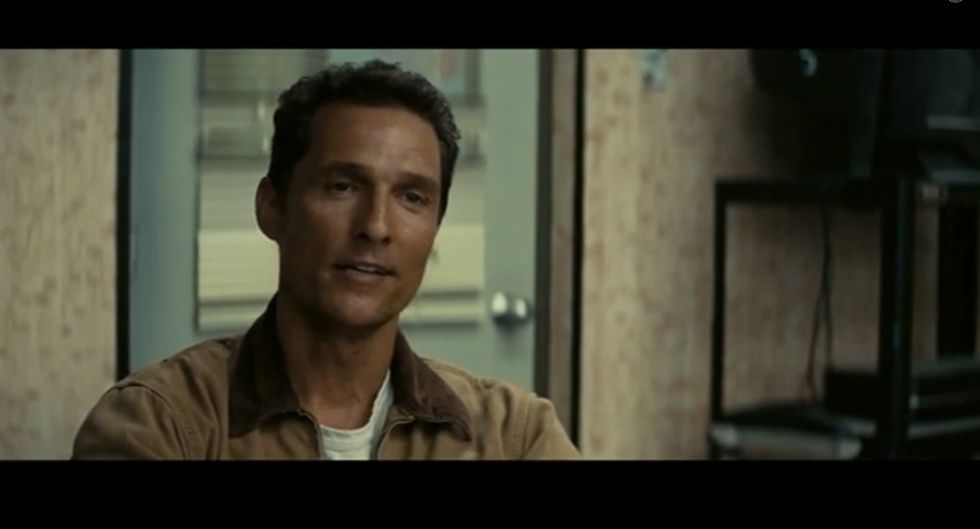In the clip, a teacher tells Matthew McConaughey's character that America never went to the moon. Instead, the official story, engrained in new textbooks, is that America staged the moon landing as part of a propaganda war to bankrupt the Soviet Union.