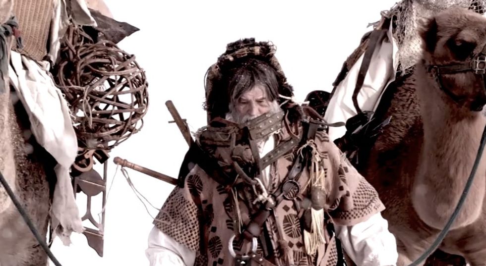 That’s how our story begins. That’s Santa? Yes, because what does a man do when he’s in that position where he has no hope, no resurrection, nothing? What does he do? He goes on an amazing journey as a hunter, as a gatherer. He eventually is hired by three wise men because he can negotiate, because nobody is going to rip them off, and he knows how to get the very best gifts. And so he negotiates with gold, frankincense, and myrrh and then has to go protect that gold, frankincense, and myrrh and then through a series of events is left there to protect the Christ child, never interacting, just watching.