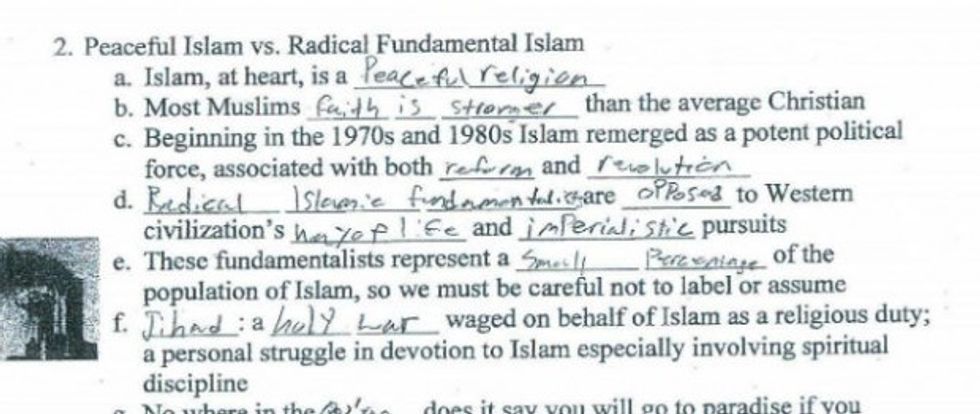 History is being rewritten. If you need an example, look no further than Union County, North Carolina, where students at Porter Ridge High School are filling out homework assignments that look to be nothing more than talking points from the Obama administration passed off as fact. One of the most disturbing questions to a student's mother was "Most Muslims’ faith is stronger than the average Christian." Does that sound like something that should be taught in school?
