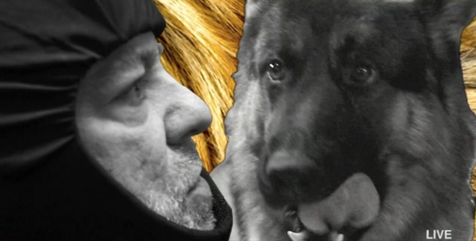 "But look, here’s the thing, I’m a realist, and if that’s what it takes to get ratings and, you know, take this network over the top, then we have to keep up with the Joneses, so by the end of tonight’s show, this dog right here—and he may look like he’s calm. He’s playing. He’s toying with you now. I want to show you, look at these teeth. See those teeth right there? Can you see those teeth? See these teeth? Look at that teeth. See that? This dog, he is amped up like crazy right now. He is just toying. This dog is going to eat that man right there."