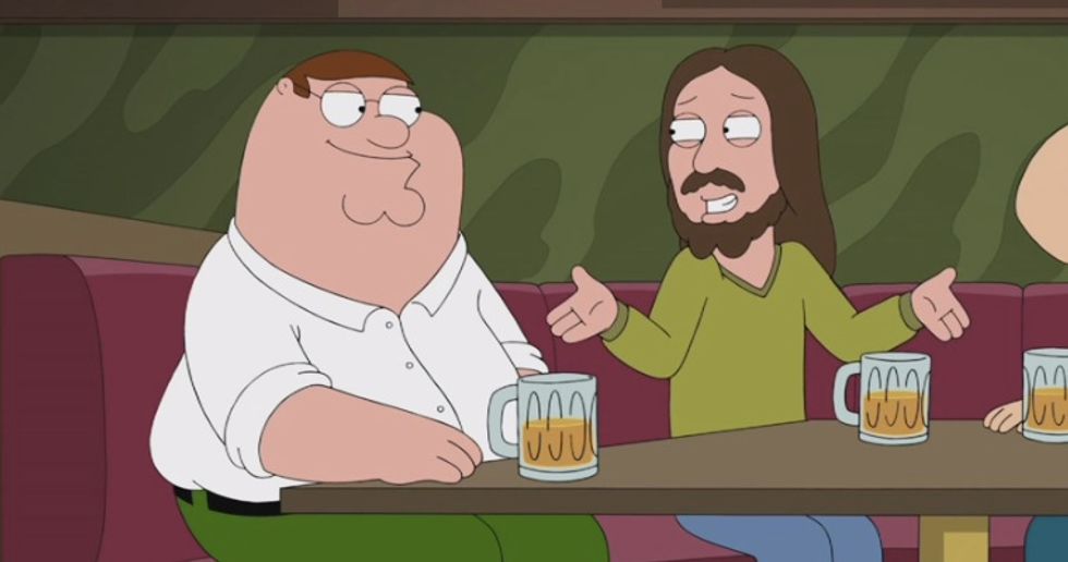 The episode description explains: "After running into Jesus at the Quahog Mall, Peter is stunned to discover that the Son of God is still a virgin. So, he enlists Quagmire and Cleveland to help him throw Jesus the best birthday ever by finding a way to help him become a man."