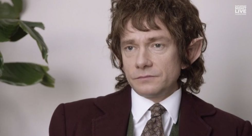 Martin Freeman may be the greatest comedic straight man of all time. The star of The Hobbit series, Sherlock, and BBC's The Office hosted Saturday Night Live this weekend to promote the release of The Hobbit: The Battle of the Five Armies, the final installment of The Hobbit trilogy. While SNL has been pretty hit-or-miss in recent years, they managed to hit a home run by melding two of Freeman's most popular characters: Bilbo Baggins from The Lord of the Rings and Tim Canterbury from The Office.