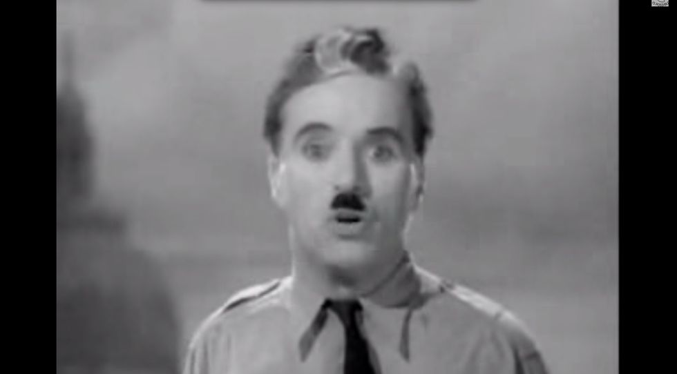 "October 15th, 1940. Charlie Chaplin does The Great Dictator where he mocks relentlessly Mussolini and Hitler. Just mocks them relentlessly," Glenn said on radio today. "At one point he comes on the stage and looks like the great dictator. They say, you have to give a speech. Well, he doesn't know what to say. He's not the dictator. He's a Jew. He's the wanted. He's the hunted. So he stands up, and here's the speech he gives."
