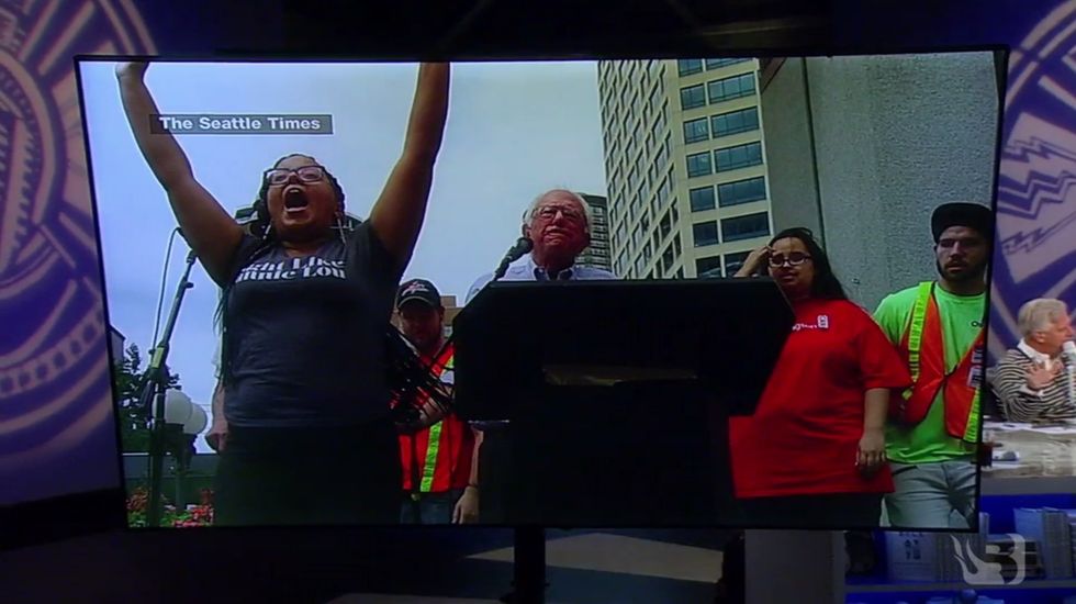 BERNIE: Thank you, Seattle, for being one of the most progressive cities in the United States of America.