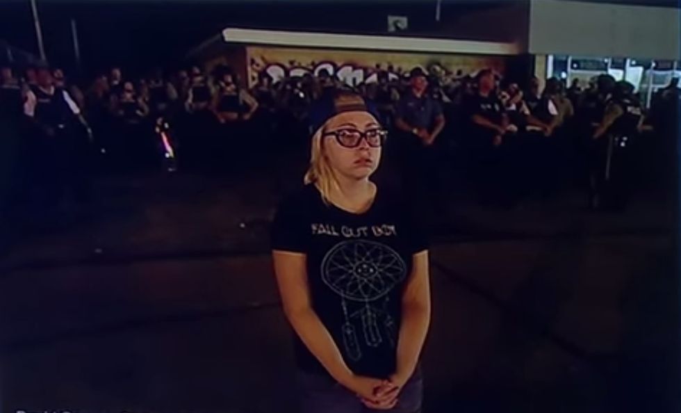 GLENN: Last night, there was a young woman who did exactly that. In one of the bravest things I've seen anyone do. This Washington University student goes out apparently by herself and stands between the protesters and the police in Ferguson. Here's what she said last night, as she is standing alone with the police about 20 feet behind her. As she is standing there all by herself, she says this. Pat doesn't have it. I stalled as long as I could.