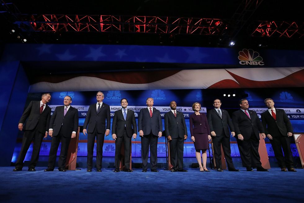 Featured Image: Presidential candidates Ohio Governor John Kasich (L-R), Mike Huckabee, Jeb Bush, Sen. Marco Rubio (R-FL), Donald Trump, Ben Carson, Carly Fiorina, Ted Cruz (R-TX), New Jersey Governor Chris Christie, and Sen. Rand Paul (R-KY) pose for a photo at the CNBC Republican Presidential Debate at University of Colorado's Coors Events Center October 28, 2015 in Boulder, Colorado. Fourteen Republican presidential candidates are participating in the third set of Republican presidential debates. (Photo by Andrew Burton/Getty Images)