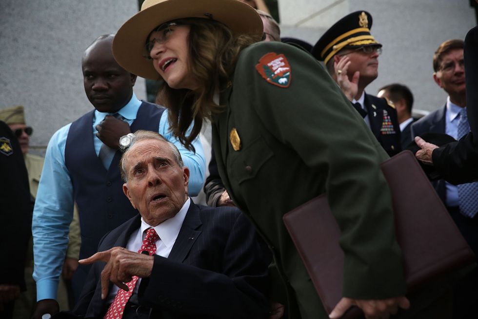 Featured Image: Former U.S. Sen. Bob Dole (R-KS) (2nd L) talks to National Mall and Memorial Parks acting superintendent Karen Cucurullo (3rd L) during an event to commemorate the 70th anniversary of the Allied Forces Victory in the Pacific and the end of World War II September 2, 2015 at the World War II Memorial in Washington, DC. The World War II effective came to an end in August, 1945, after Japanese forces surrendered to the forces of the Allied Powers. (Photo by Alex Wong/Getty Images)