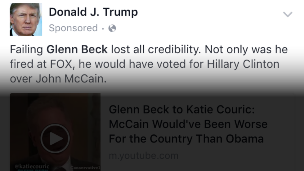 Following Glenn's official endorsement of Ted Cruz on Saturday, the following sponsored message began circulating on Facebook from none other than Donald J. Trump: