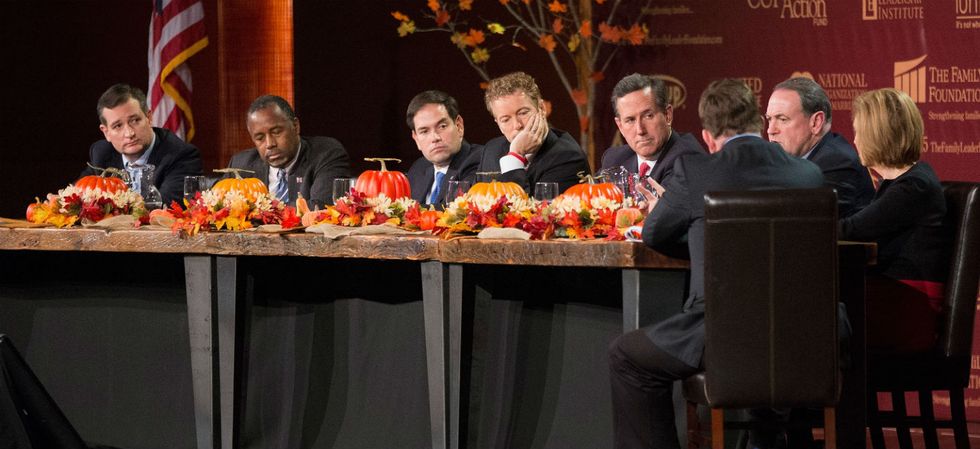 Featured Image: Republican presidential candidates (R-L) Sen. Ted Cruz (R-TX), Ben Carson, New Jersey Governor Chris Christie and Sen. Rand Paul (R-KY) participate in the Fox News - Google GOP Debate January 28, 2016 at the Iowa Events Center in Des Moines, Iowa. Residents of Iowa will vote for the Republican nominee at the caucuses on February 1. Donald Trump, who is leading most polls in the state, decided not to participate in the debate. (Photo by Scott Olson/Getty Images)