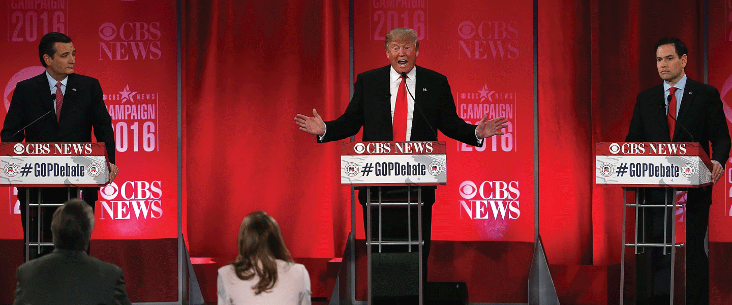 Featured Image: Republican presidential candidates (L-R) Sen. Ted Cruz (R-TX), Donald Trump and Sen. Marco Rubio (R-FL) participate in a CBS News GOP Debate February 13, 2016 at the Peace Center in Greenville, South Carolina. Residents of South Carolina will vote for the Republican candidate at the primary on February 20. (Photo by Spencer Platt/Getty Images)