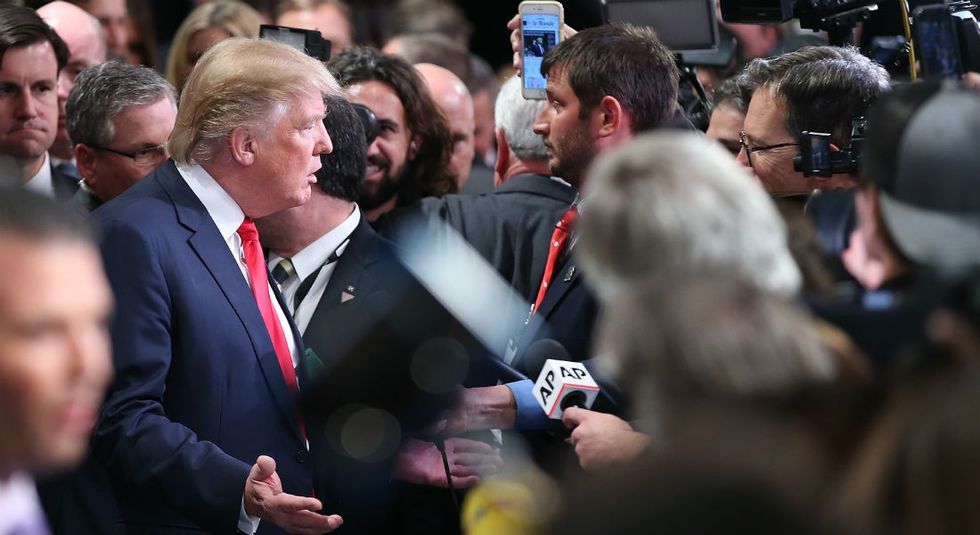 Featured Image: Republican presidential candidate Donald Trump speaks to the media in the spin room after the Fox Business Network Republican presidential debate at the North Charleston Coliseum and Performing Arts Center on January 14, 2016 in North Charleston, South Carolina. The sixth Republican debate is held in two parts, one main debate for the top seven candidates, and another for three other candidates lower in the current polls. (Photo by Scott Olson/Getty Images)