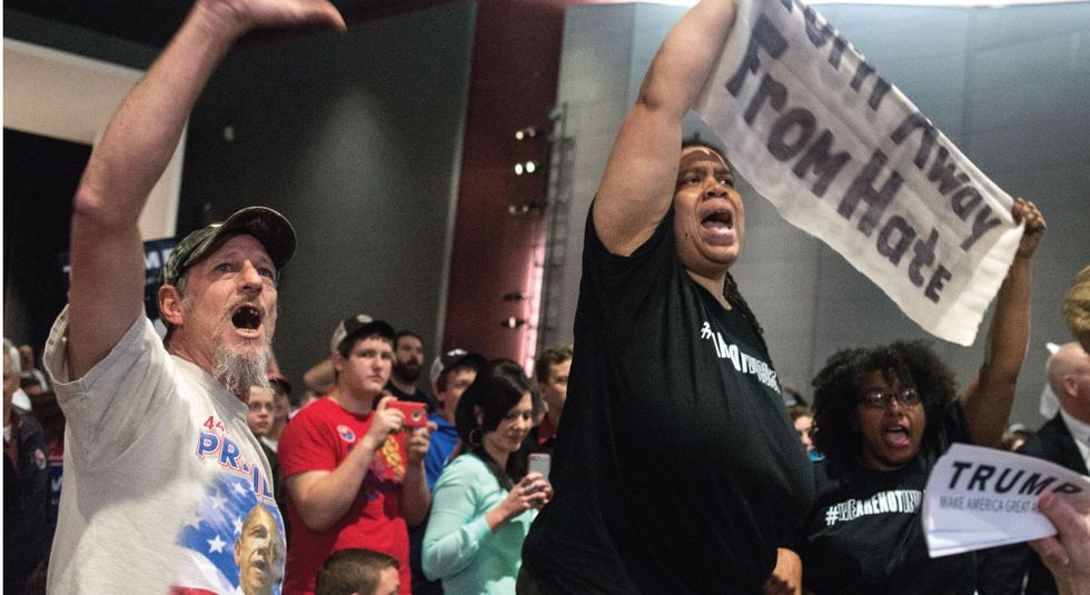 Featured Image: Protestors disrupt a campaign rally for Republican presidential candidate Donald Trump at Lenoir-Rhyne University March 14, 2016 in Hickory, North Carolina. The North Carolina Republican primary will be held March 15. (Photo by Sean Rayford/Getty Images)