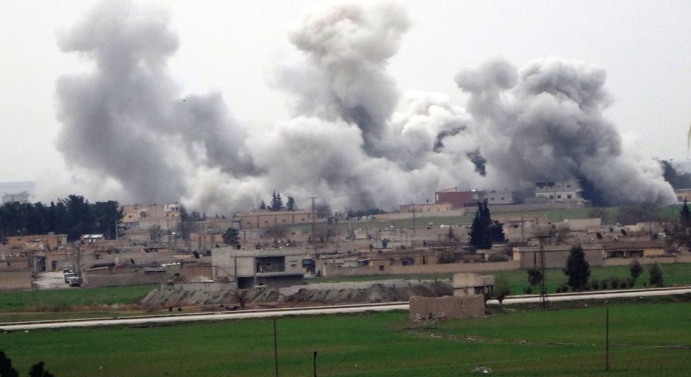 Featured Image: A picture taken on February 27, 2016 in Akcakale in Sanliurfa province shows smoke rising from the neightborhood of Syrian city Tel Abyad during clashes between Islamic State Group and People's Protection Units (YPG). (Photo Credit: STR/AFP/Getty Images)