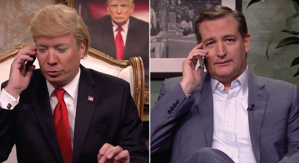 It happened at about 3:54 of this pretty funny Jimmy Fallon/Ted Cruz phone call skit (Fallon is playing Trump; Cruz is playing, well, Cruz).