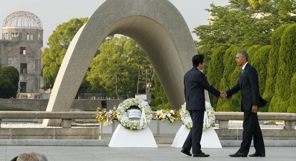 Featured Image: US President Barack Obama (R) shakes hands with Japanese Prime Minister Shinzo Abe (L) after laying a wreath in front of the cenotaph to offer a prayer for victims of the atomic bombing in 1945 at Hiroshima Peace Memorial Park in Hiroshima on May 27, 2016. (Photo by KIMIMASA MAYAMA/AFP/Getty Images)