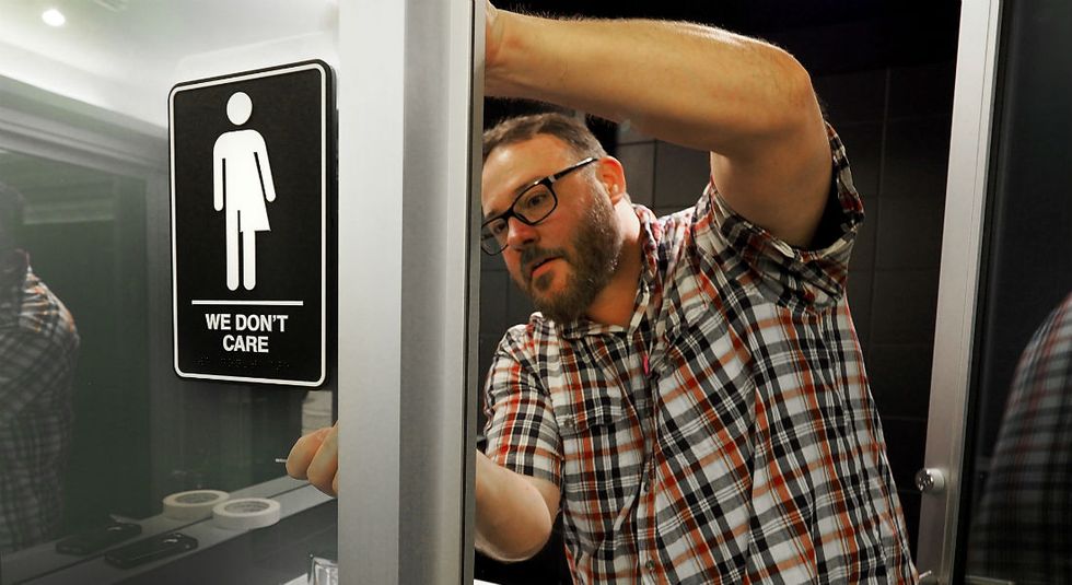 Featured Image: Museum manager Jeff Bell adheres informative backing to gender neutral signs in the 21C Museum Hotel public restrooms on May 10, 2016 in Durham, North Carolina. (Photo by Sara D. Davis/Getty Images)