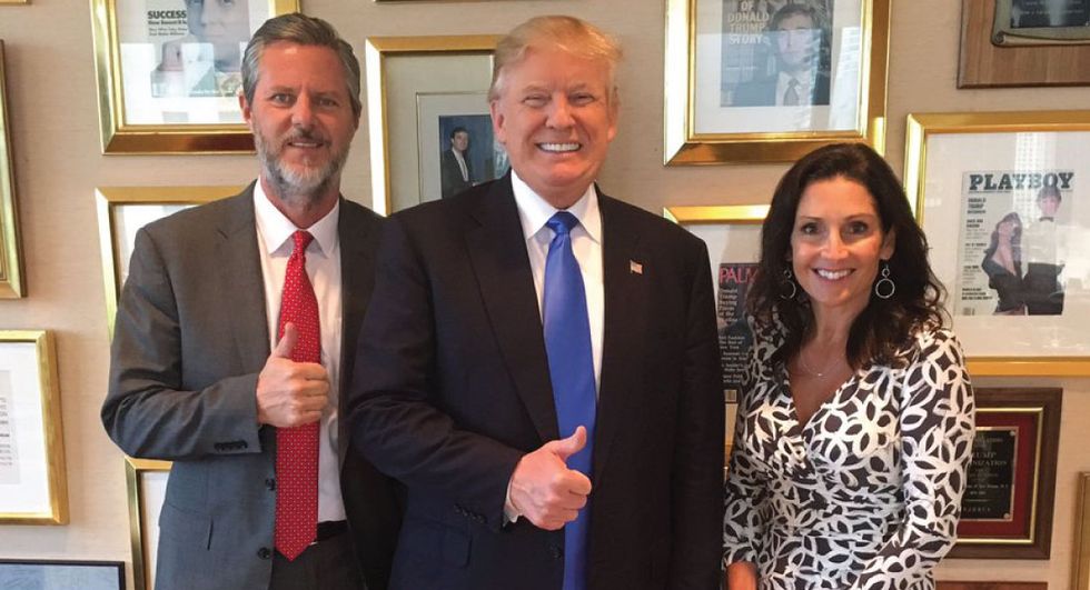 Featured Image: Jerry Falwell, Donald Trump, Becki Falwell pictured in front of a framed cover of Playboy magazine.