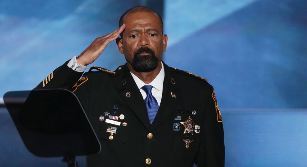 Featured Image: Milwaukee County Sheriff David Clarke salutes the crowd prior to delivering a speech on the first day of the Republican National Convention on July 18, 2016 at the Quicken Loans Arena in Cleveland, Ohio. (Photo by Alex Wong/Getty Images)