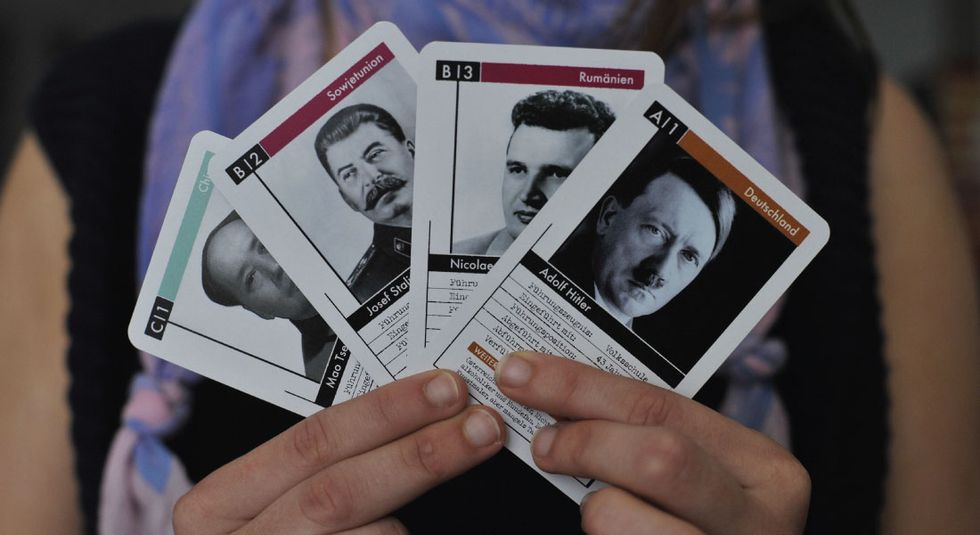 Featured Image: A woman holds up cards featuring (from L to R) Mao Zedong, Josef Stalin, Nicolae Ceausescu and Adolf Hitler from the 'Das Fuehrer Quartett' (Tyrant Quartet) card game at a Berlin shop on July 17, 2008. The game is based on a popular German children's card game called Quartet, (in English 'Happy Families'). In this version, the cards present pictures and information on notorious historical figures such as Joseph Stalin, Francisco Franco and Adolf Hitler. (Photo Credit: JOHN MACDOUGALL/AFP/Getty Images)