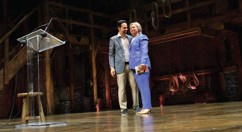 Featured Image: U.S. Democratic presidential candidate Hillary Clinton and Lin-Manuel Miranda, creator of the Broadway musical 'Hamilton' stand onstage after a special performance of the Tony-winning musical at the Richard Rodgers Theatre on July 12, 2016 in New York City. Clinton hosted a fundraiser at the special performance, with supporters paying from $2,700 to up to $100,000 for the chance to attend. (Photo by Yana Paskova/Getty Images)
