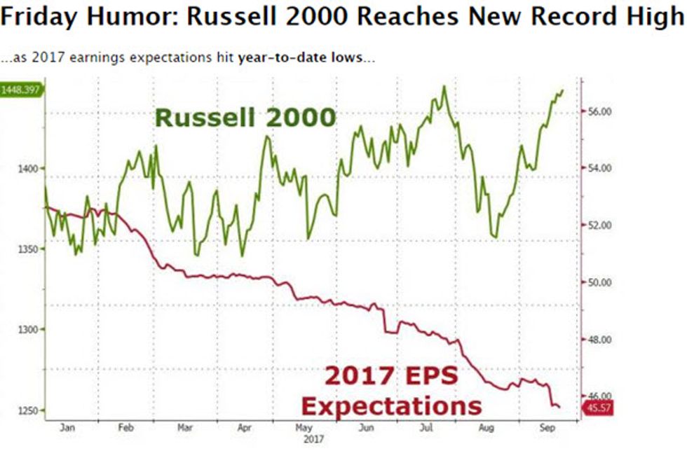 Another feature of bubbles is that they require prices to depart wildly from their underlying fundamentals. Well, we need look no further than small cap stocks in the US, which have just hit a brand new record high as earnings have been in terminal decline: