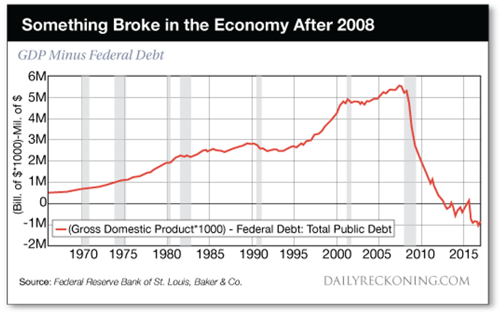 The chart below clearly shows that, since then, we've been in an era of diminishing returns in exchanging debt for growth: