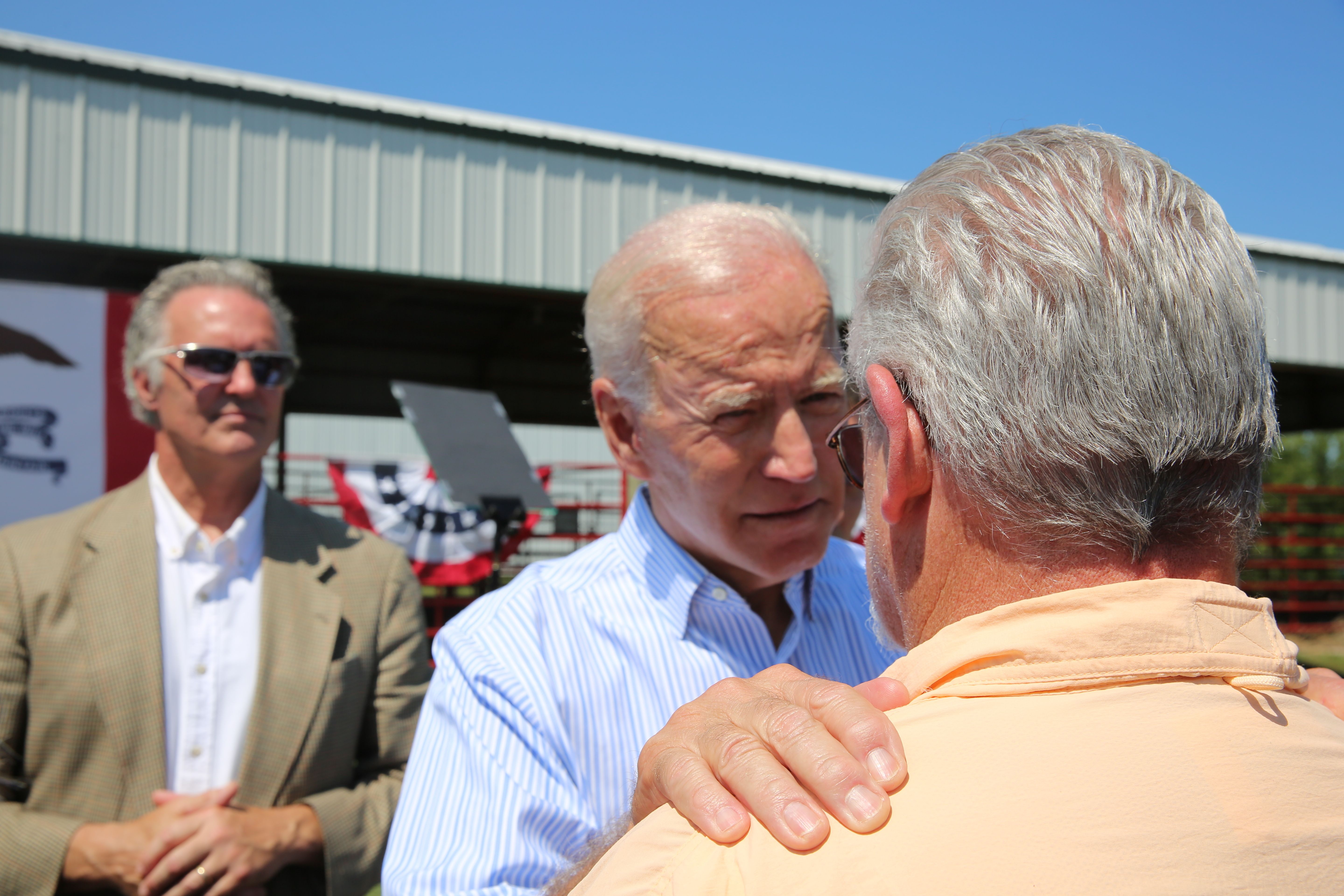 Joe Biden leaned into the white barn. Up and to the left, a green sign that said "SWINE."
